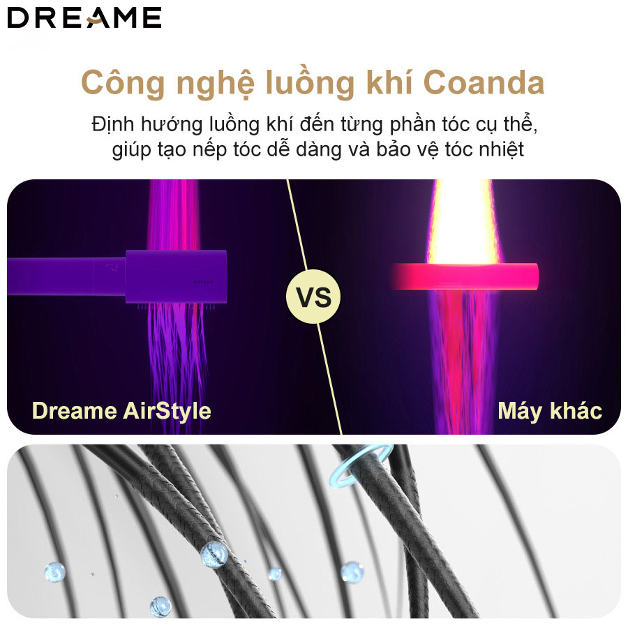 Hiệu ứng Coanda sử dụng luồng khí mạnh mẽ, tốc độ cao để cuốn tóc một cách tự nhiên vào các phụ kiện đi kèm. Nguyên tắc này giúp tạo kiểu (uốn, duỗi, làm mượt) một cách hiệu quả mà không cần dựa vào nhiệt độ quá cao. Luồng khí sẽ bám sát bề mặt cong của phụ kiện, nhẹ nhàng định hình tóc, giảm thiểu đáng kể nguy cơ hư tổn do nhiệt so với các dòng máy sấy truyền thống.