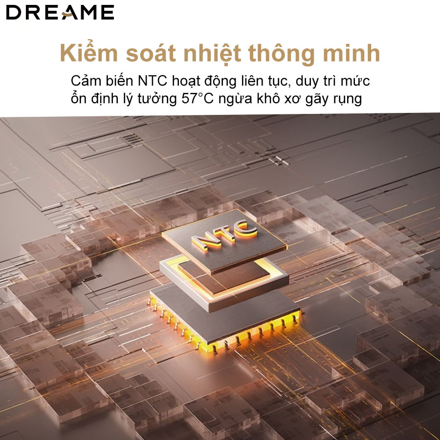 Máy được trang bị cảm biến NTC hoạt động liên tục, theo dõi nhiệt độ luồng khí hàng trăm lần mỗi giây. Mục tiêu là duy trì nhiệt độ sấy ổn định ở mức lý tưởng 57°C – ngưỡng nhiệt được các chuyên gia khuyến nghị để làm khô tóc nhanh nhưng vẫn ngăn ngừa khô xơ, gãy rụng và tổn hại đến lớp biểu bì tóc. Khả năng phân bổ nhiệt đồng đều và chính xác này đảm bảo tóc được sấy khô hiệu quả mà không cần chịu đựng nhiệt độ quá cao, giúp mái tóc luôn bóng khỏe và duy trì độ ẩm tự nhiên.