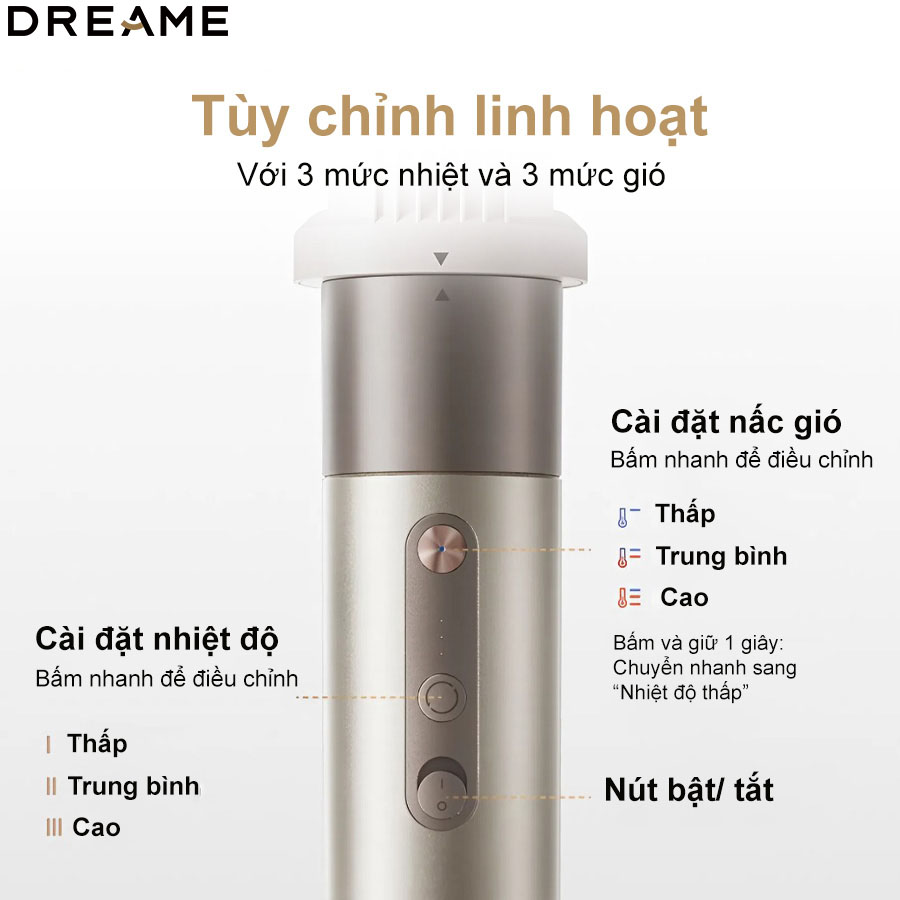 Tùy chỉnh Linh hoạt: Máy cung cấp khả năng cài đặt linh hoạt với 3 mức nhiệt và 3 nấc gió độc lập. Người dùng có thể dễ dàng kiểm soát luồng khí và nhiệt độ sao cho phù hợp nhất với tình trạng và loại tóc của mình: