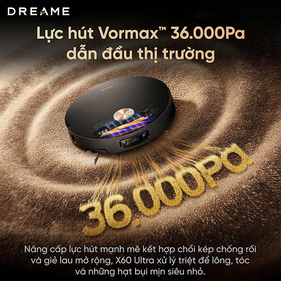 Robot hút bụi lau nhà Dreame X60 Ultra sở hữu động cơ Vormax™ với lực hút lên tới 36.000Pa, mang lại khả năng làm sạch ấn tượng trên nhiều loại bề mặt như sàn gỗ, gạch hay thảm dày. Nhờ sức hút mạnh, robot dễ dàng xử lý các loại bụi mịn, tóc, vụn rác hay cát nhỏ mà không cần di chuyển nhiều lần.