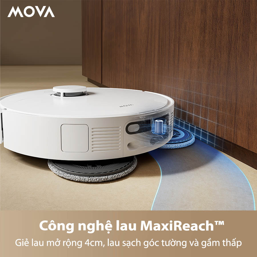 Công nghệ MaxiReach™ cho phép giẻ lau tự động mở rộng khi tiếp cận tường và góc cạnh. Nhờ khả năng vươn sâu đến 4cm, robot làm sạch hiệu quả các khu vực như chân tường, mép tủ, cạnh sofa, những vị trí thường khó tiếp cận với robot lau nhà thông thường. Điều này giúp bề mặt sàn được làm sạch đồng đều, hạn chế tình trạng sót bụi dọc theo viền nhà.