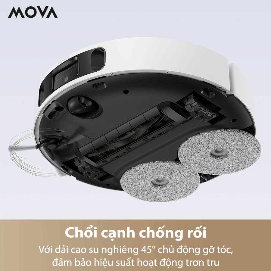 Mova E40 Ultra được trang bị chổi cạnh thiết kế mới với dải cao su nghiêng 45°, giúp dẫn tóc và lông thú cưng xuống dưới trong quá trình quét. Cơ chế này làm giảm đáng kể hiện tượng tóc quấn vào chổi, duy trì hiệu suất hút ổn định và giảm tần suất vệ sinh thủ công cho người dùng.