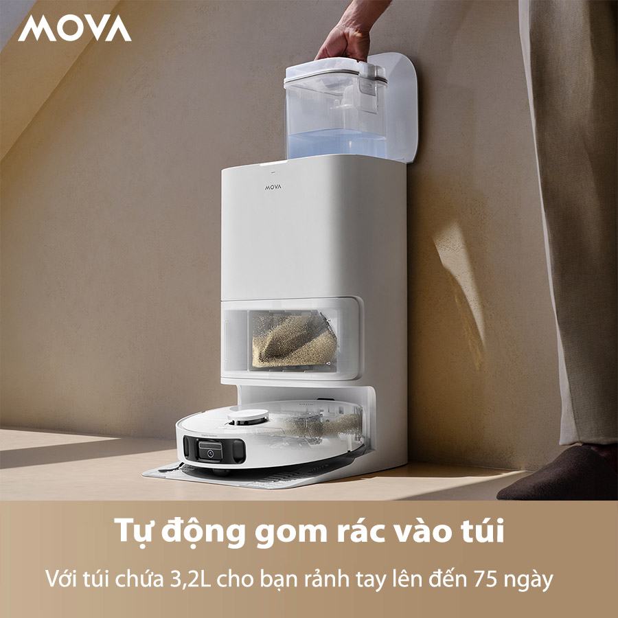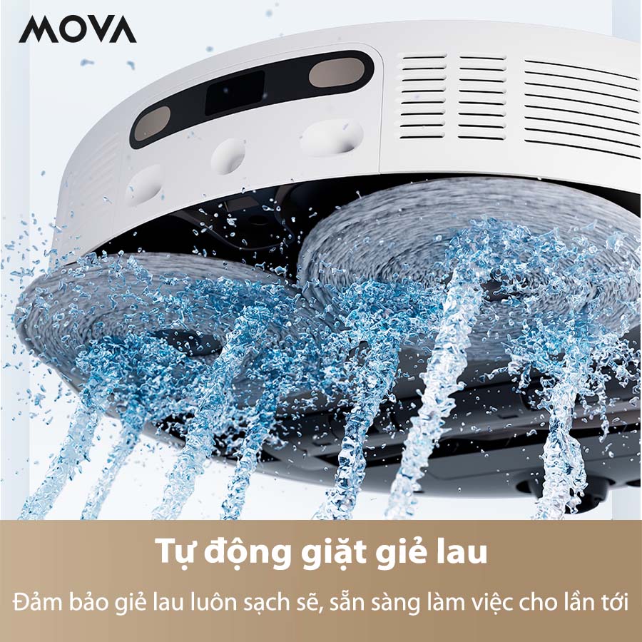 Không chỉ sạc pin, trạm dock của Mova E40 Ultra còn đóng vai trò như một trung tâm bảo trì thông minh. Robot tự động quay về dock để giặt giẻ lau bằng nước sạch từ bình 4,5L, sau đó xả nước bẩn vào ngăn chứa 4L, giúp giẻ luôn sạch sẽ mà không cần giặt tay.