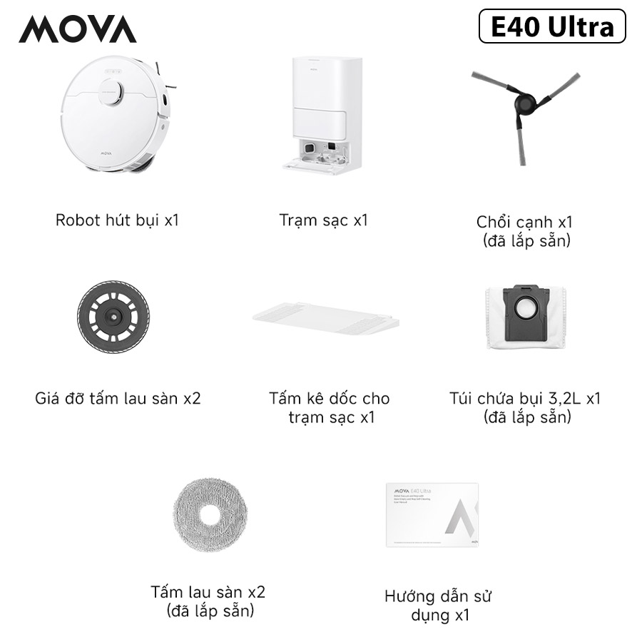 Robot hút bụi lau nhà Mova E40 Ultra được định vị ở phân khúc tầm trung với hiệu suất làm sạch vượt trội và khả năng tự động hóa toàn diện. Trang bị lực hút mạnh mẽ lên đến 19.000Pa, công nghệ lau sát cạnh MaxiReach™ cùng trạm sạc đa năng tự động đổ bụi, giặt và sấy khô giẻ lau, thiết bị mang đến trải nghiệm dọn dẹp rảnh tay lên đến 75 ngày.