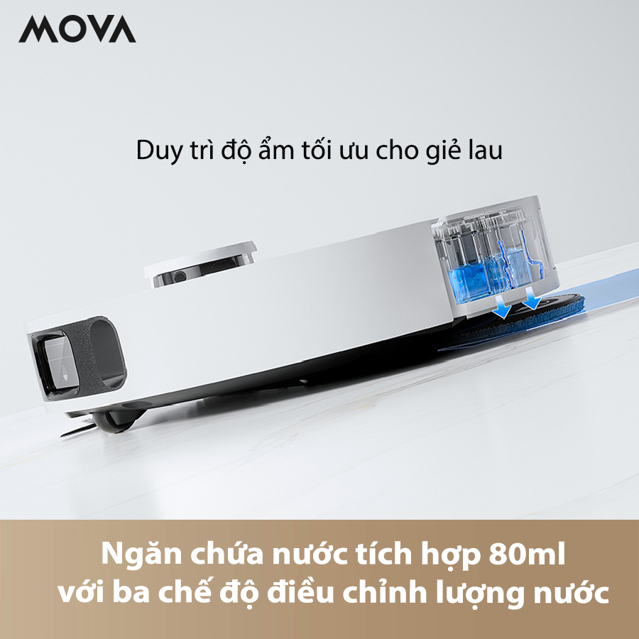Robot Mova E40 Ultra cho phép người dùng lựa chọn 3 mức nước phù hợp với từng khu vực và loại sàn. Mức nước thấp thích hợp cho nhà có thú cưng hoặc sàn gỗ, chế độ tiêu chuẩn dùng cho vệ sinh hằng ngày, trong khi mức nước cao giúp xử lý hiệu quả các khu vực bẩn nặng cần lau kỹ. Bình nước tích hợp 80ml trên robot đảm bảo độ ẩm ổn định trong suốt quá trình làm sạch.