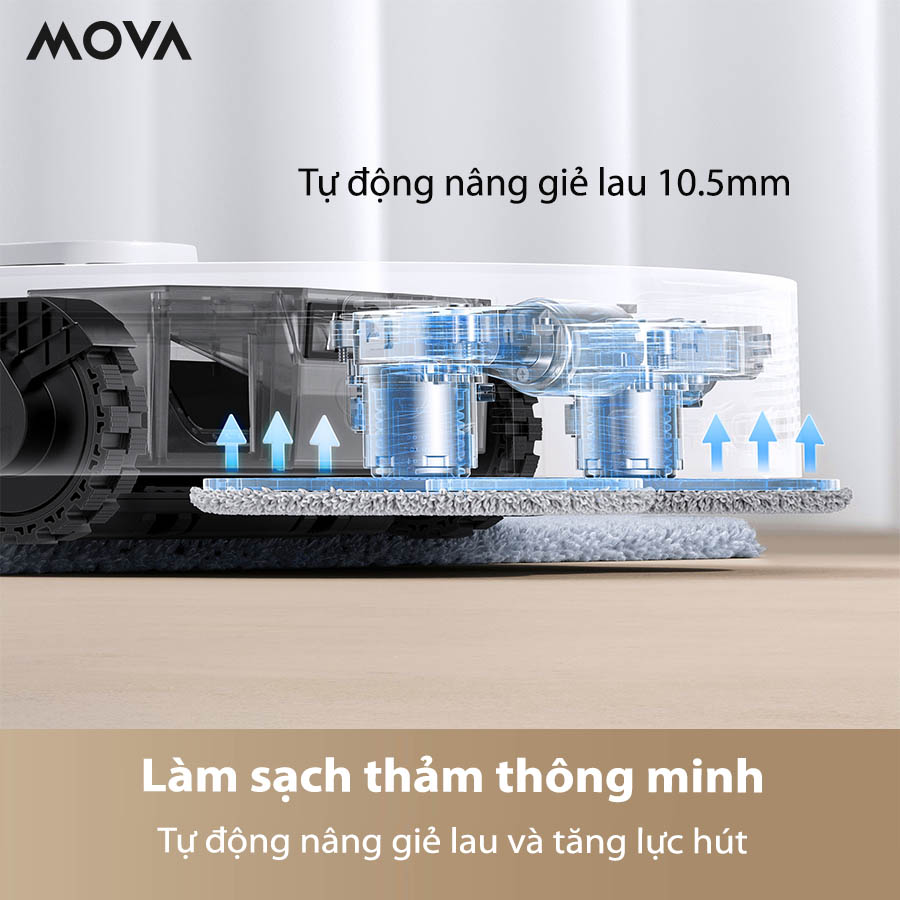Nhờ công nghệ nhận diện thảm bằng sóng siêu âm, Mova E40 Ultra có thể phát hiện chính xác khu vực có thảm. Khi di chuyển lên thảm, giẻ lau sẽ tự động nâng cao đến 10,5mm và lực hút được tăng cường, giúp làm sạch sâu sợi thảm mà vẫn giữ thảm khô ráo, sạch sẽ.