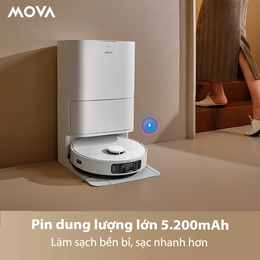 Robot được trang bị pin dung lượng 5.200mAh, cho phép hoạt động bền bỉ trong thời gian dài. Công nghệ sạc nhanh giúp rút ngắn thời gian chờ đến 30%, đảm bảo robot nhanh chóng sẵn sàng tiếp tục chu trình làm sạch, đặc biệt phù hợp với các căn hộ và nhà ở diện tích lớn.