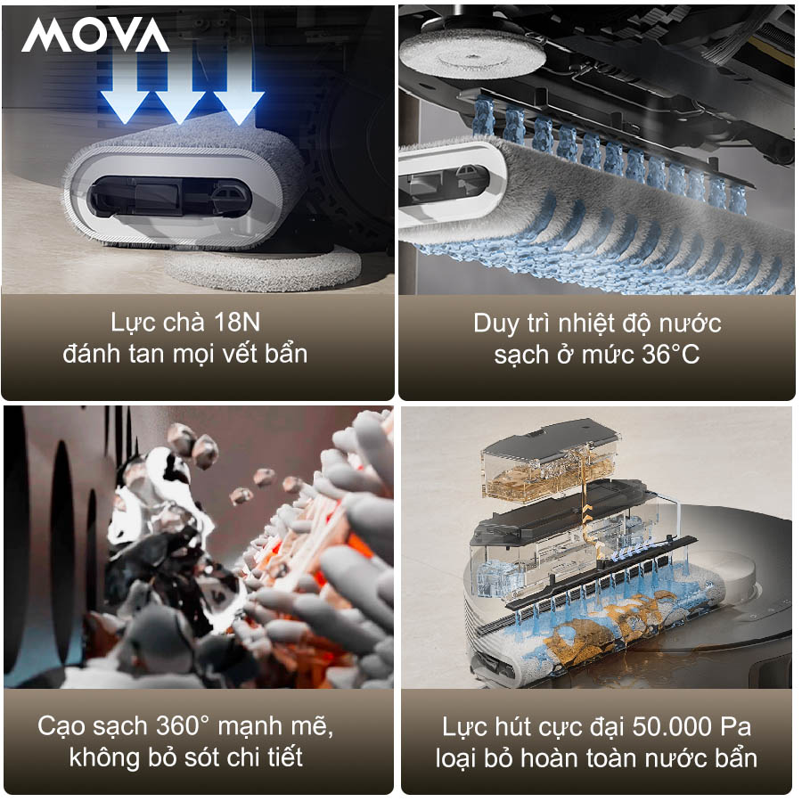 Giẻ lau sợi nguyên khối của Mova Z50 Ultra tạo lực chà lên đến 18N, đủ mạnh để loại bỏ vết bẩn bám lâu ngày. Nước ấm 36°C giúp hòa tan dầu mỡ, vết bẩn khô mà vẫn an toàn cho sàn gỗ, sàn vinyl và đá tự nhiên. Hệ thống hút nước thải công suất lớn lên tới 50.000Pa giúp giẻ luôn sạch, hạn chế bắn bẩn ngược và rút ngắn thời gian khô sàn.