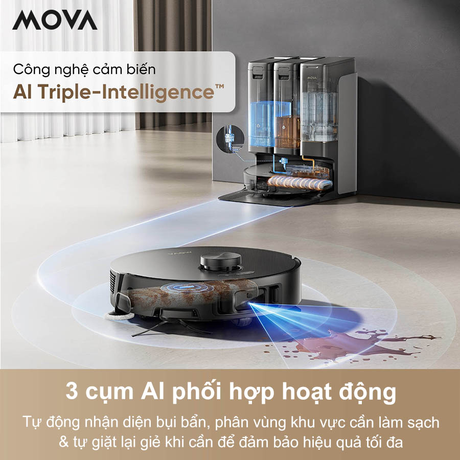 Công nghệ AI Triple-Intelligence™ kết hợp trí tuệ nhân tạo trên robot, camera và trạm sạc, cho phép hệ thống phân tích mức độ bẩn, điều chỉnh lực hút, lượng nước và lộ trình làm sạch ngay trong lúc vận hành. Khi cần thiết, robot tự động quay về trạm để giặt giẻ, đảm bảo hiệu quả làm sạch luôn ở mức tối ưu.