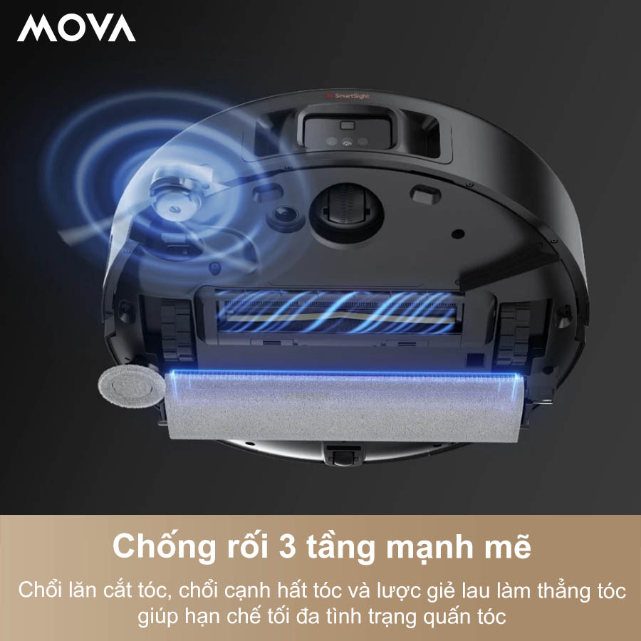 Hệ thống chống rối trên Mova Z50 Ultra kết hợp chổi lăn cắt tóc, chổi cạnh hất tóc và lược giẻ lau làm thẳng sợi, giúp hạn chế tối đa tình trạng quấn rối. Robot vận hành ổn định, giảm thời gian vệ sinh và bảo trì thủ công.