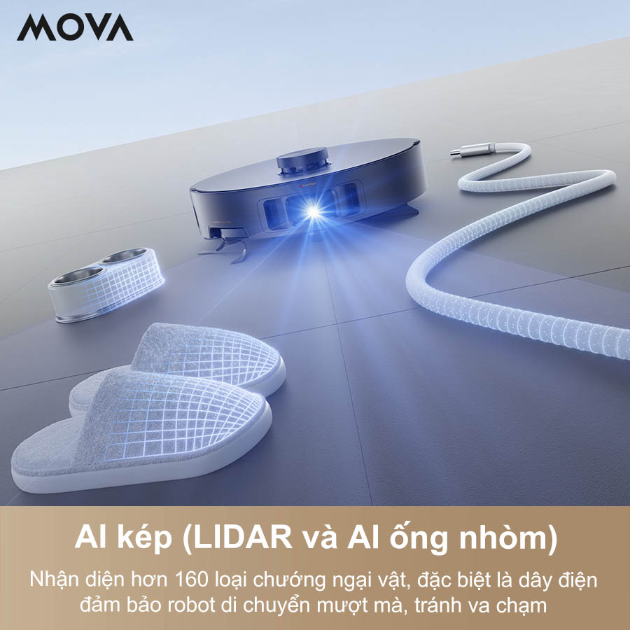 Sự kết hợp giữa LiDAR và AI ống nhòm giúp robot nhận diện hơn 160 loại chướng ngại vật, bao gồm cả dây điện. Nhờ đó, Mova Z50 Ultra di chuyển mượt mà trong không gian phức tạp, hạn chế va chạm và đảm bảo an toàn cho gia đình.