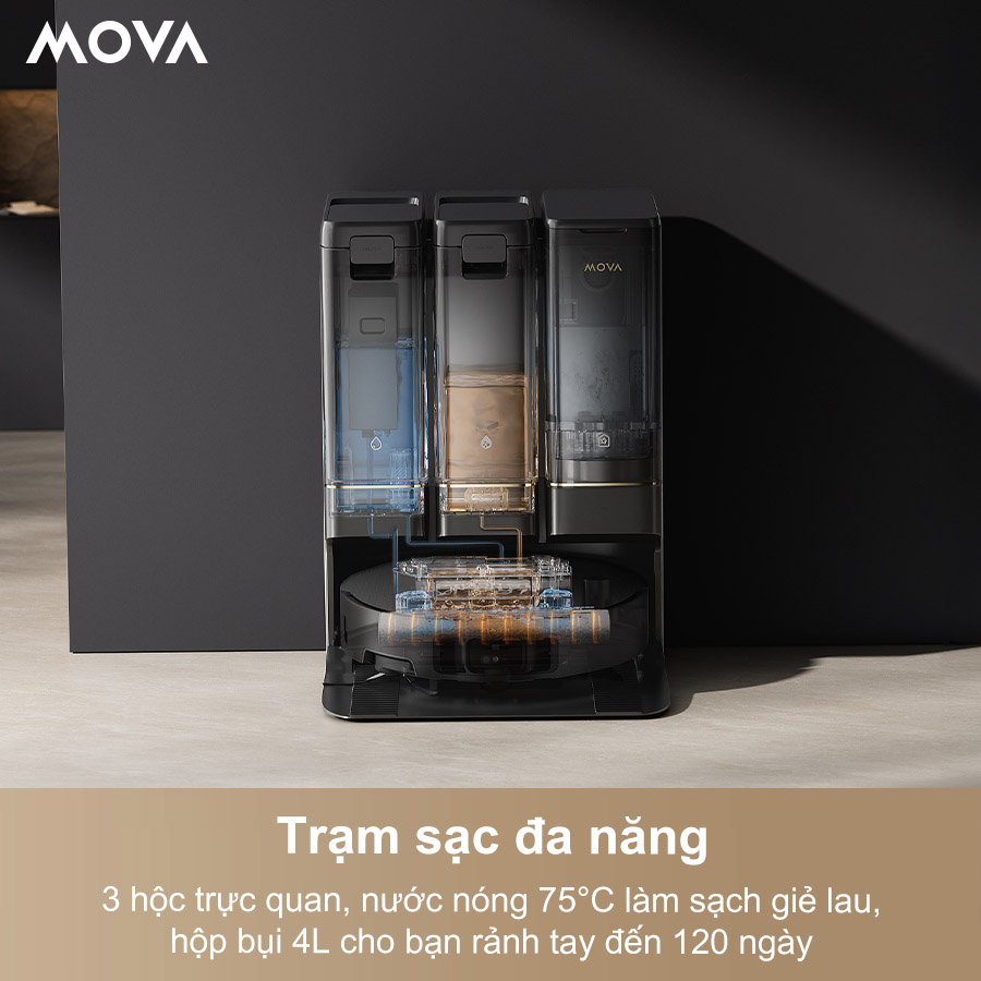 Trạm sạc của Mova Z50 Ultra tự động giặt giẻ bằng nước nóng 75°C, sấy khô và khử khuẩn hiệu quả. Túi bụi dung tích lớn 4L cho phép người dùng sử dụng robot lên tới 120 ngày mà không cần can thiệp thường xuyên, mang lại trải nghiệm rảnh tay đúng nghĩa.